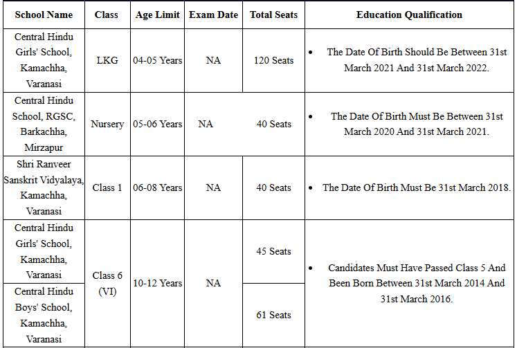 | 👉आयु सीमा | - | - | विद्यालय प्रवेश (LKG, नर्सरी, कक्षा 1 एवं कक्षा 6) : आयु की गणना 31/03/2026 के अनुसार की जाएगी। स्कूल प्रवेश परीक्षा (SET) कक्षा 9 एवं कक्षा 11 : आयु की गणना 31/03/2026 के अनुसार की जाएगी। BHU CHS SET 2026 से संबंधित अधिक जानकारी के लिए आधिकारिक वेबसाइट पर जाएँ। |