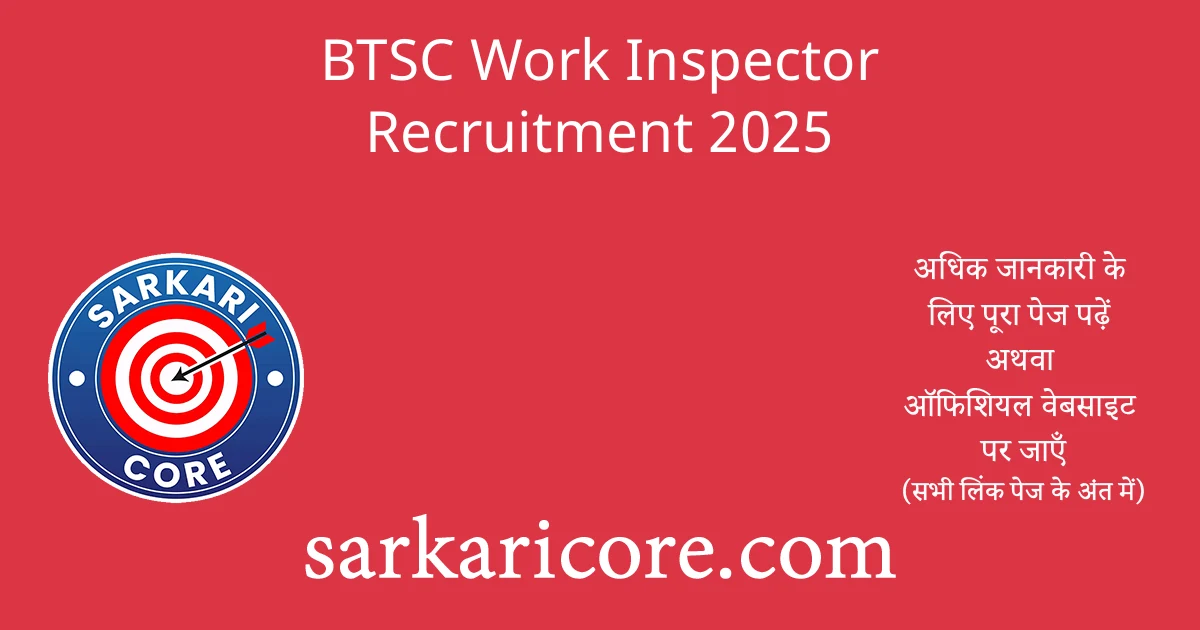 बिहार तकनीकी सेवा आयोग (BTSC) ने वर्क इंस्पेक्टर के पदों पर भर्ती के लिए अपनी आधिकारिक वेबसाइट पर एक अधिसूचना जारी की है। यह भर्ती 1114 पदों के लिए है। BTSC के आवेदन पत्र 5 दिसंबर 2025 से शुरू हो गए हैं और उम्मीदवार 5 जनवरी 2026 तक आवेदन कर सकते हैं। 1 अगस्त 2025 तक न्यूनतम आयु 18 वर्ष और अधिकतम आयु 42 वर्ष (पदानुसार) निर्धारित है। उम्मीदवार BTSC वर्क इंस्पेक्टर भर्ती 2025 की पूरी जानकारी नीचे दिए गए लिंक पर देखें। (विज्ञापन संख्या 25/2025)